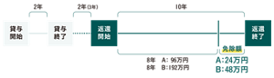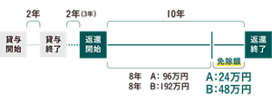 「❶定額返還方式」において返還開始から8年間、一度も返還遅延やトラブルなどがない場合、貸与金額の20%を免除します。「❷一括返還方式」の場合も20%免除の対象とします。