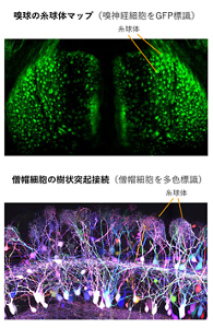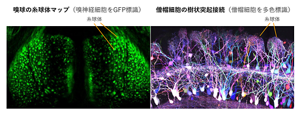 我々は環境中の多様な匂いを、嗅上皮に発現する嗅覚受容体によって検出しています。ヒトで約400種類、マウスで約1,000種類も存在する嗅覚受容体によって検出された匂いの情報は、脳の嗅球において「匂いマップ」として表現され、これが匂いの識別の基盤となっています。しかしながら、この匂いマップを支える神経回路がどのような仕組みで構築されるのかについては長年の謎でした。